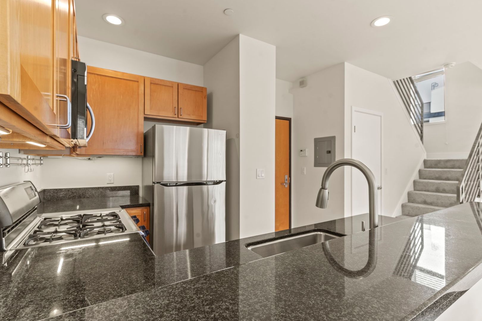 The main floor of the unit includes a complete kitchen with all stainless steel appliances, half bath, dining, and living areas. The 2nd floor holds the 2 spacious bedrooms with large windows that let in tons of light. There is also a full bath and washer and dryer. The top floor (3rd) provides access to a private and dedicated rooftop deck. The unit also includes 1 dedicated parking space in a secured and shared garage.