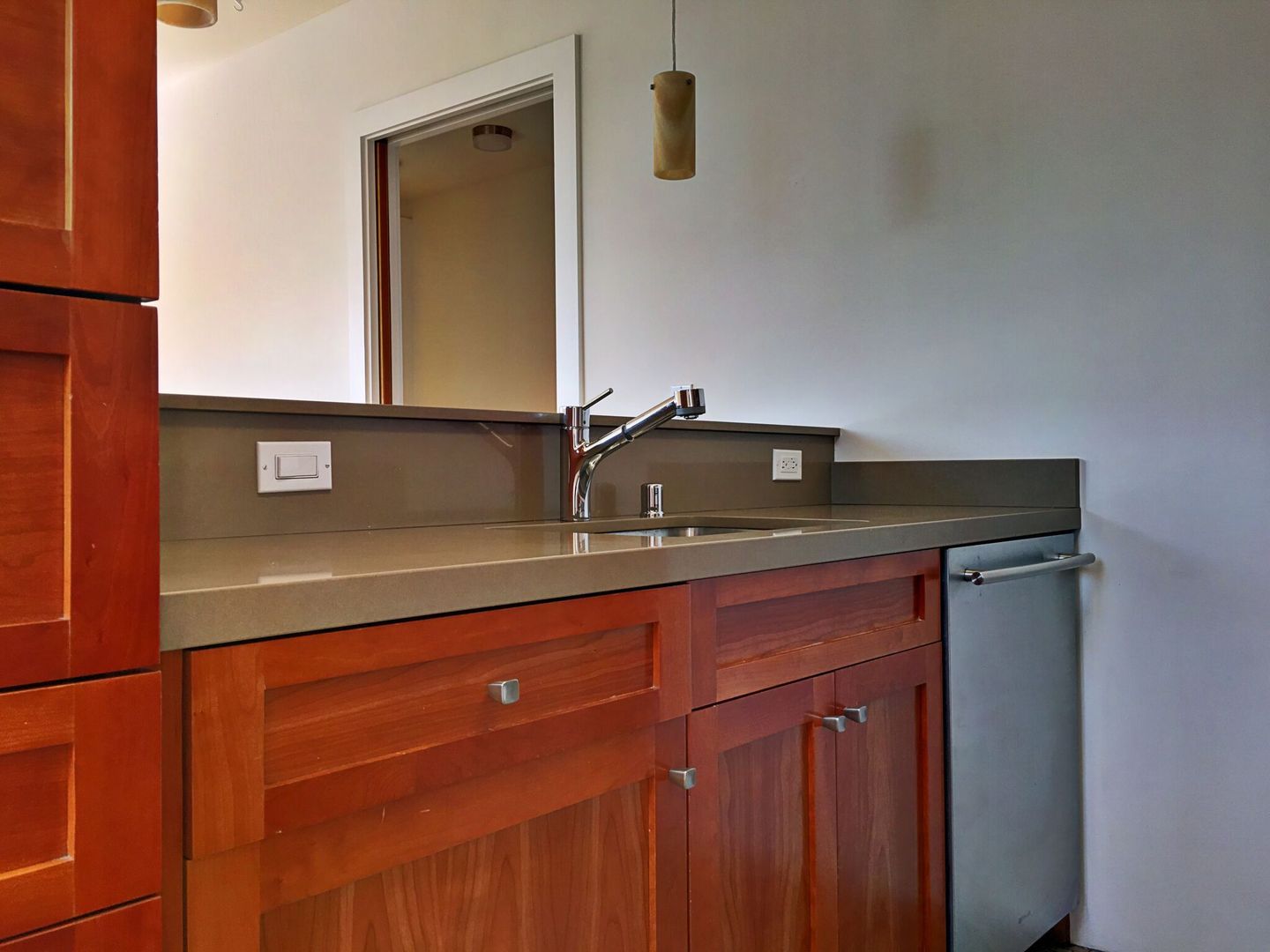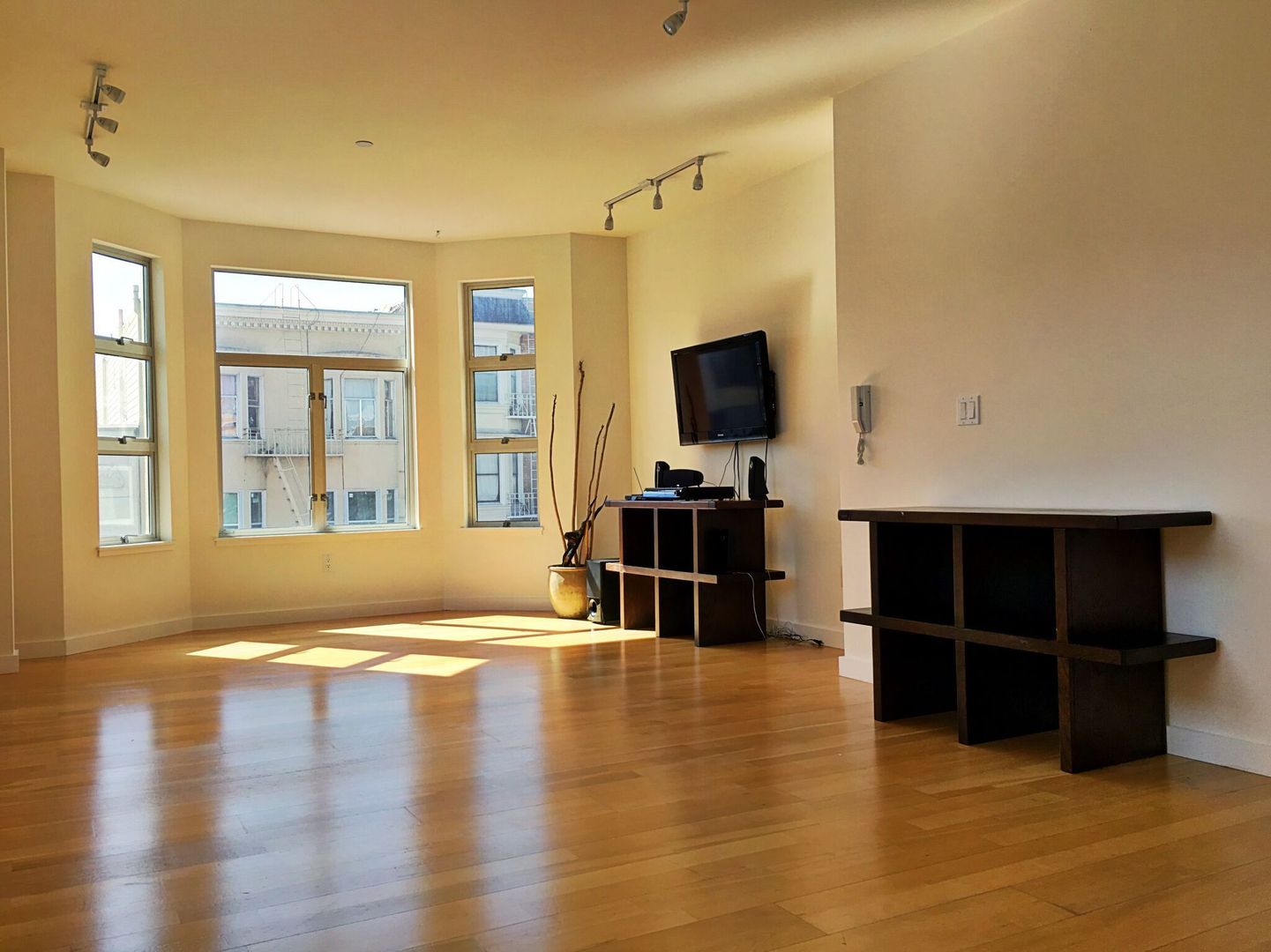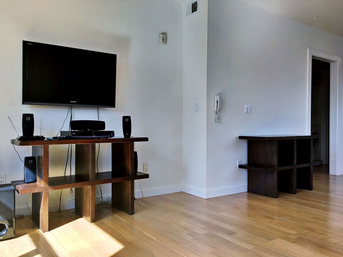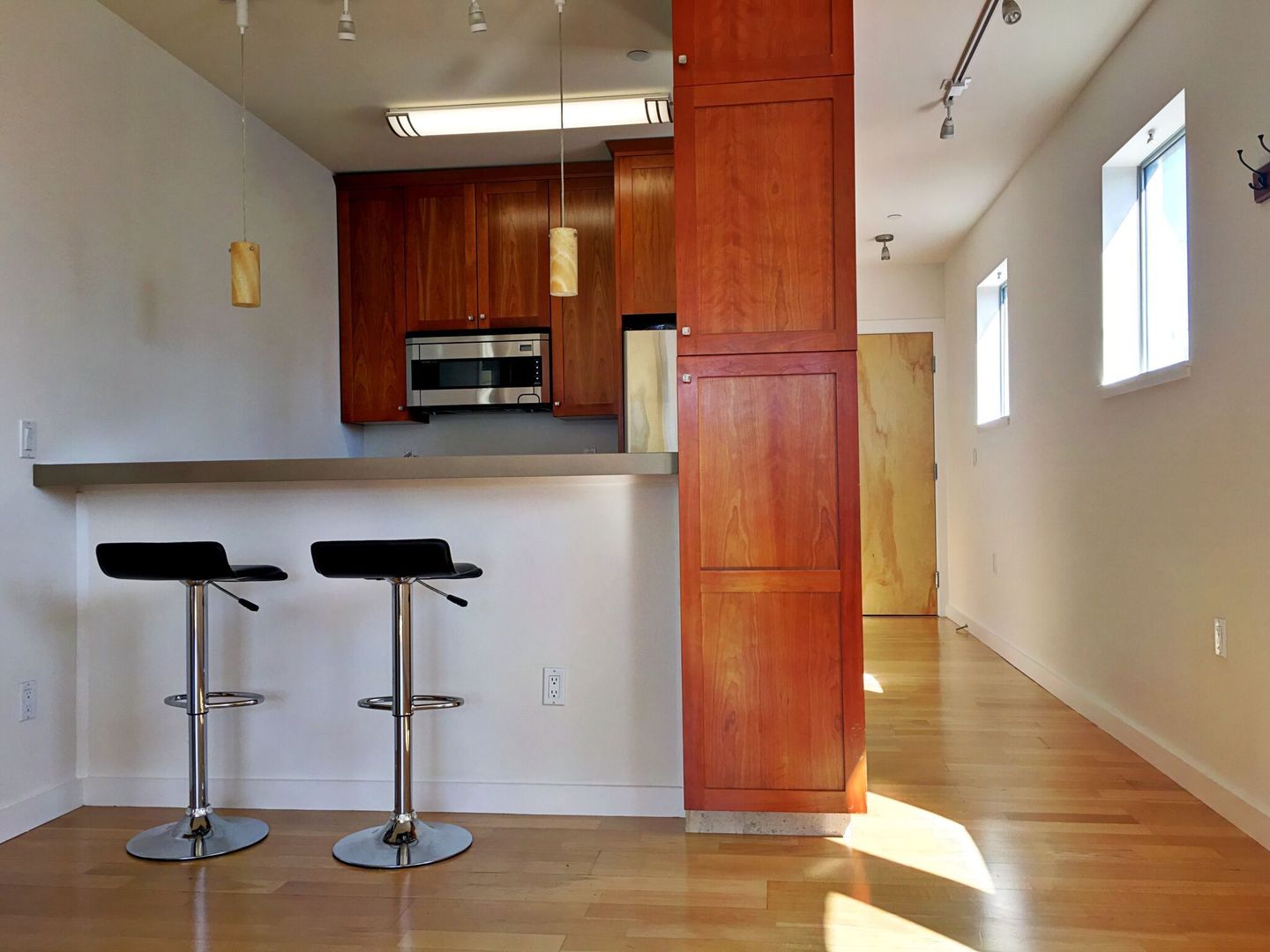 3 Bed, 2 Full Bath condo in the Mission. The unit opens up into a hallway with access to the first full bath. The bath features a modern design with a waterfall tub fixture and glass bowl style sink. Just past the bath is the kitchen with bar. The kitchen features plenty of cabinets for storage, and high end stainless steel appliances including a gas stove, dishwasher, refrigerator, and microwave. Through the kitchen is the spacious living area.
