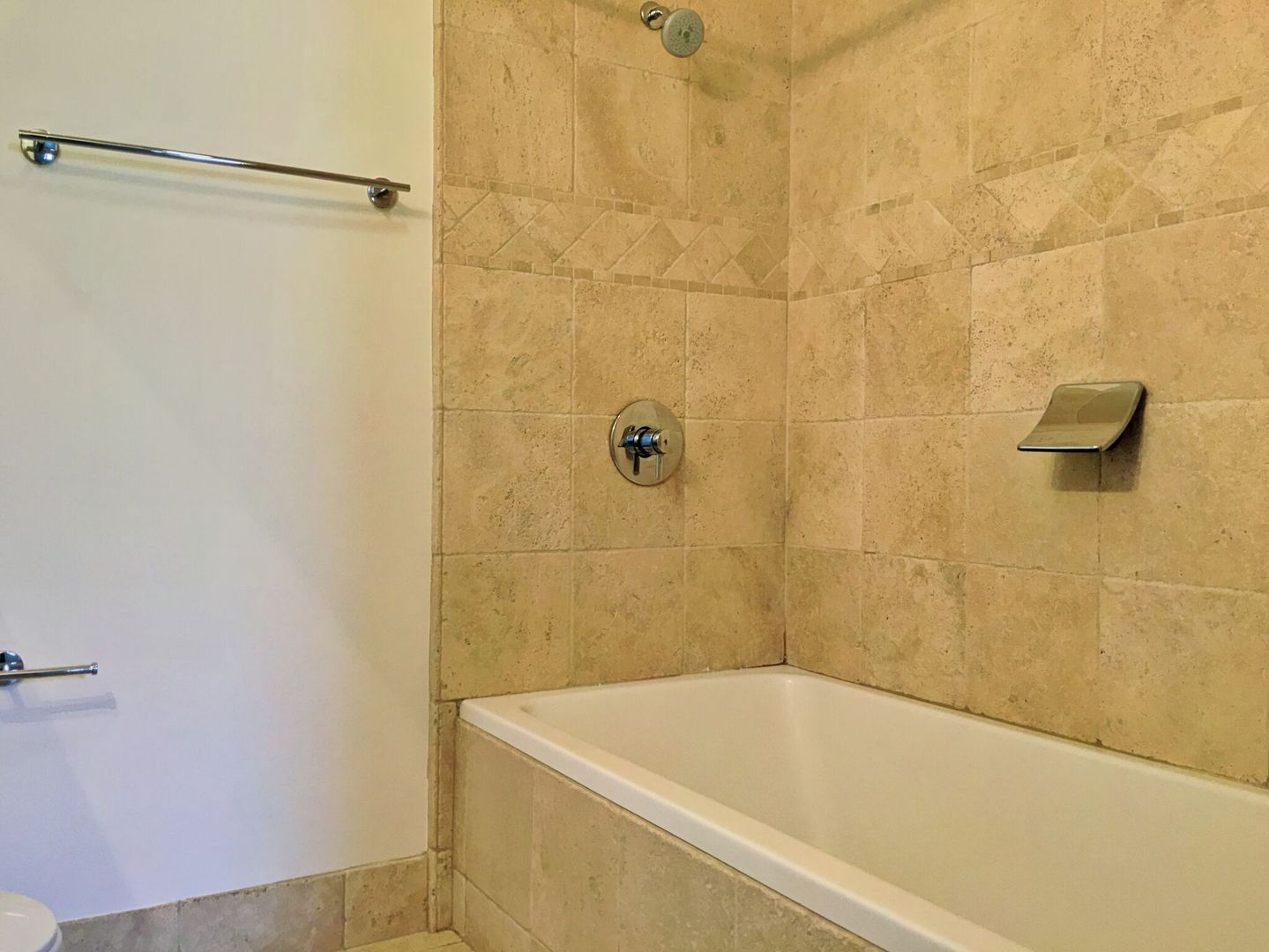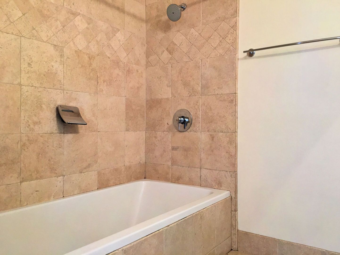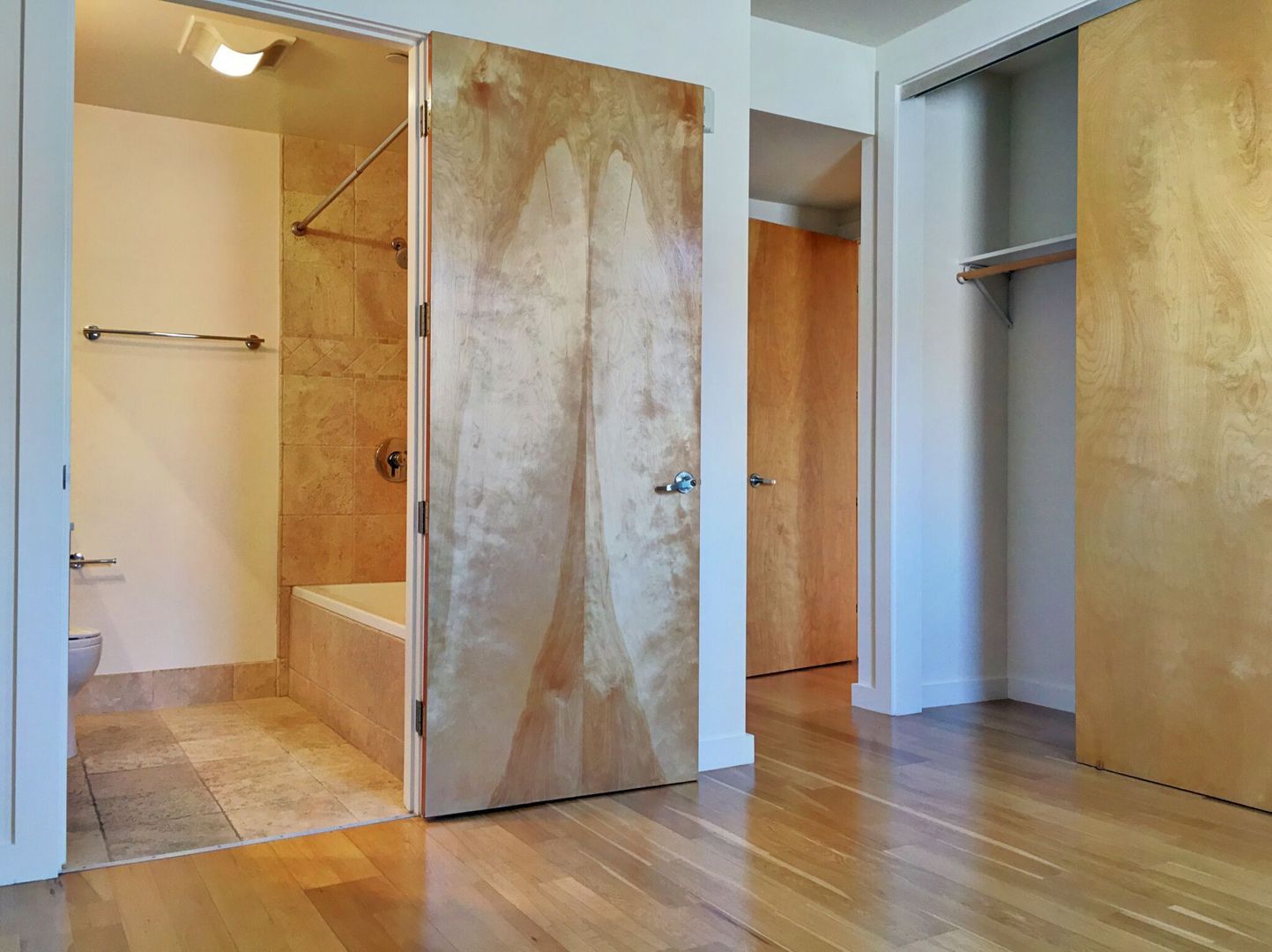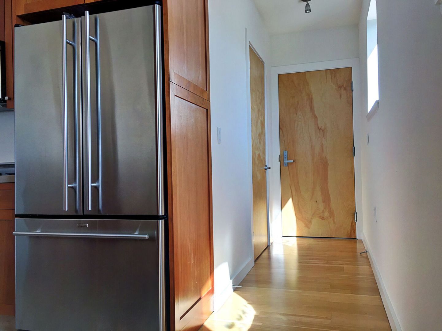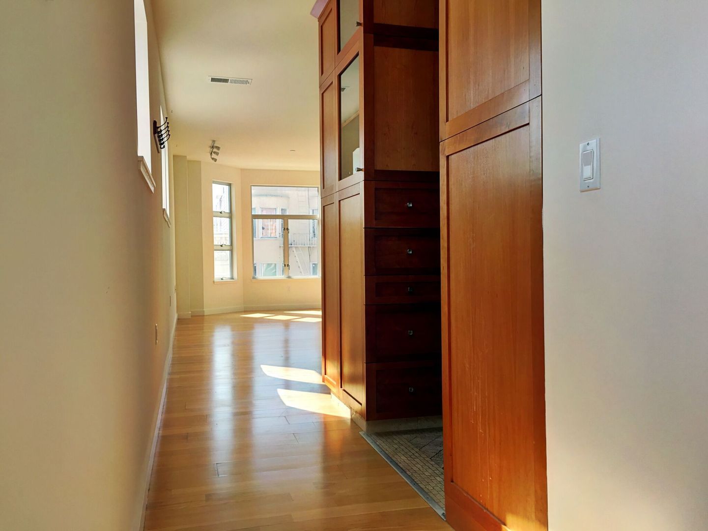 3 Bed, 2 Full Bath condo in the Mission. The unit opens up into a hallway with access to the first full bath. The bath features a modern design with a waterfall tub fixture and glass bowl style sink. Just past the bath is the kitchen with bar. The kitchen features plenty of cabinets for storage, and high end stainless steel appliances including a gas stove, dishwasher, refrigerator, and microwave. Through the kitchen is the spacious living area.